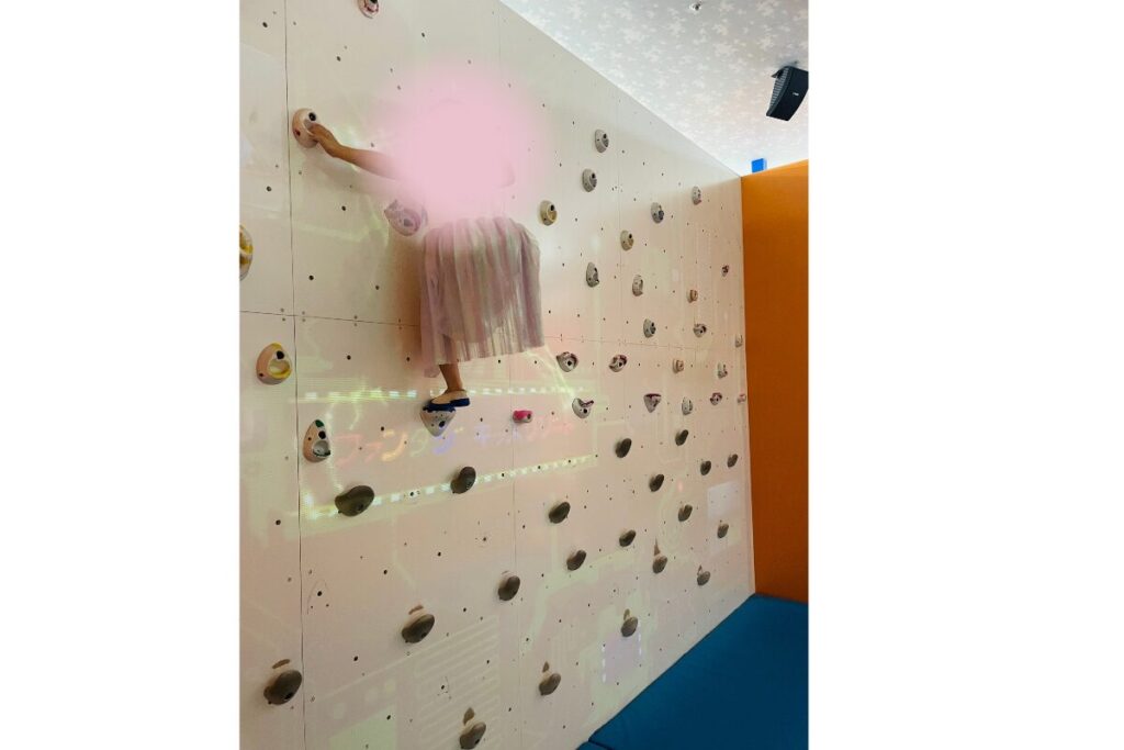 そしてもうひとつ娘が夢中になっていたのが、デジタル演出付きのボルダリング。 壁に映像が投影されるユニークな仕掛けで、まるで冒険ゲームの中にいるような感覚! 上履きを履いてマットの上で安全に登れる設計なので、親も安心して見守れます。